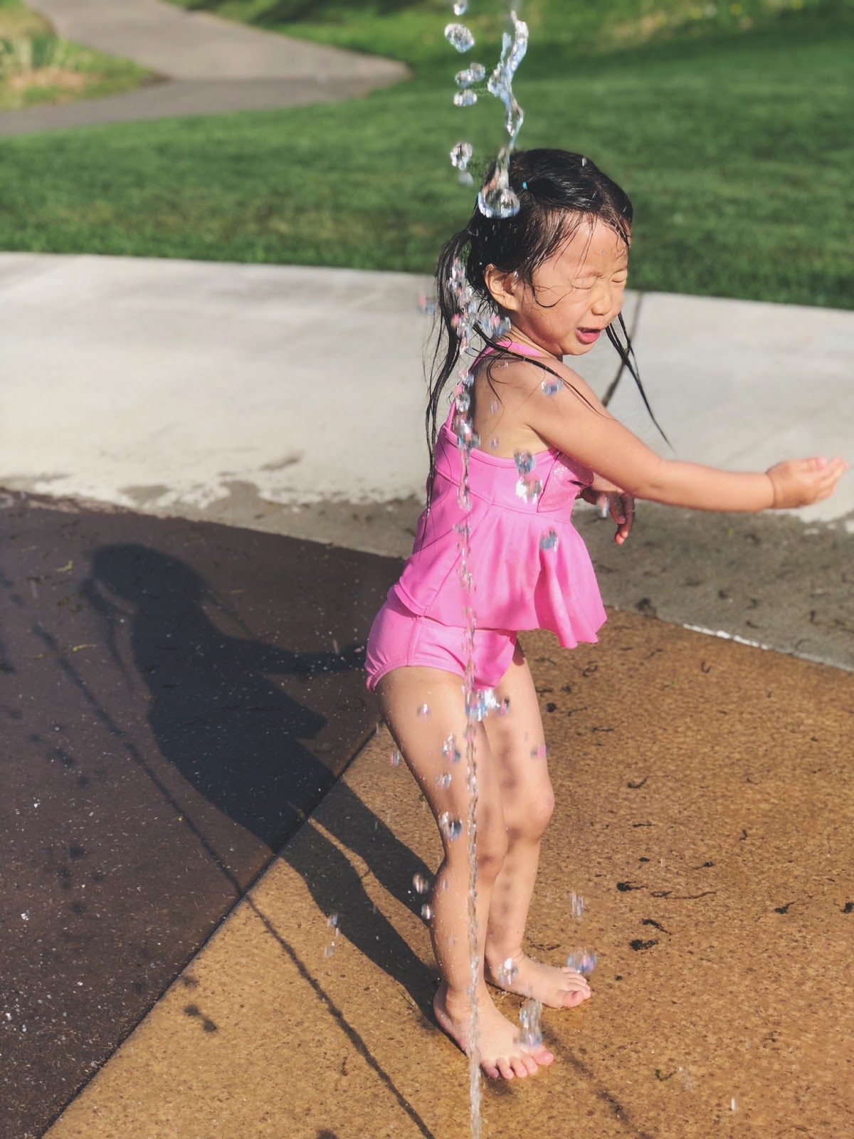 The splash pad for little kids has mini fountains and sprinklers. It's also far enough away from the big kid splash pad so kiddos aren't accidentally pinned down by one of those water-dumping buckets. Zoey (16 months) was comfortable exploring on her own in this area.